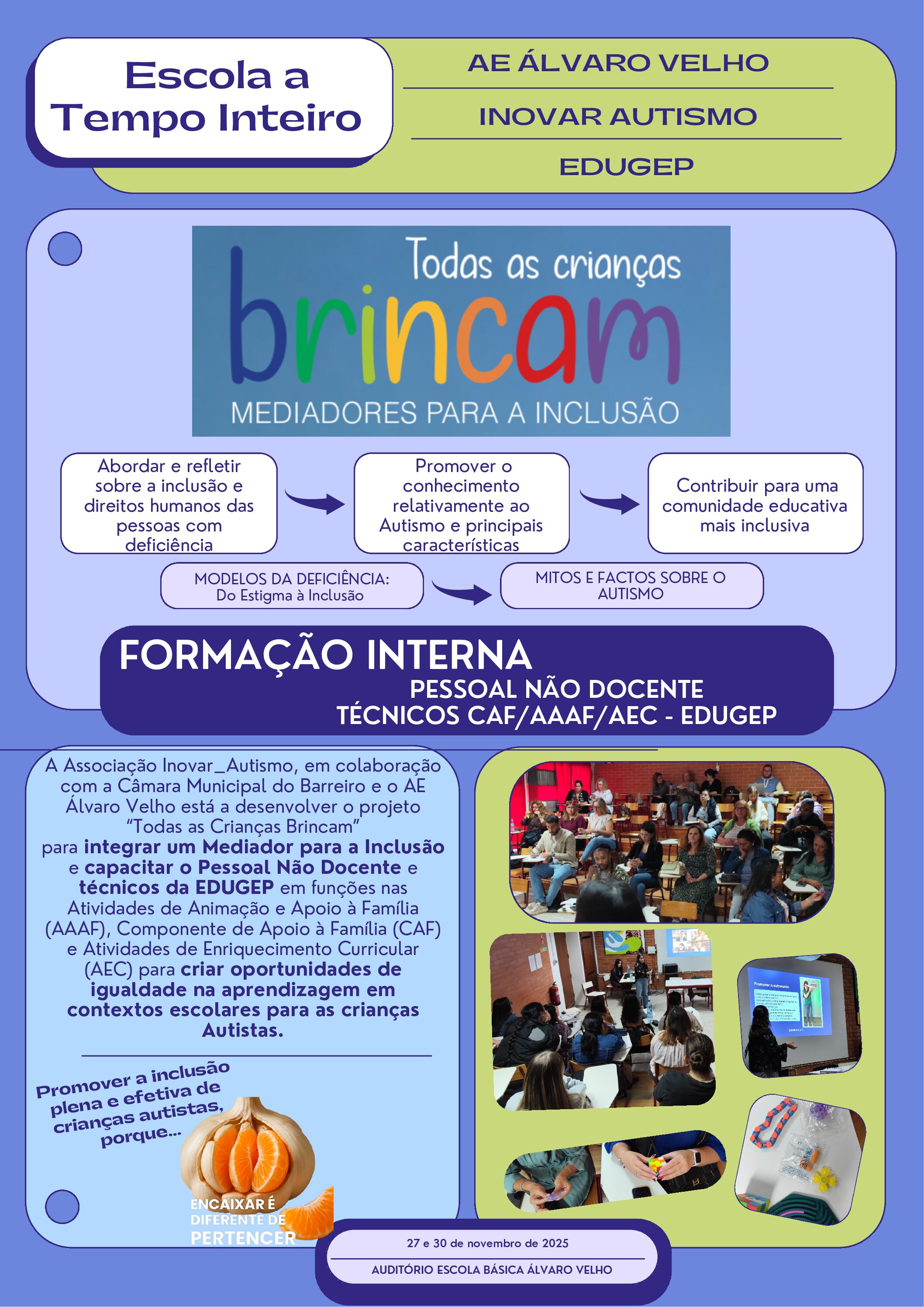 Decorrente do balanço do Diagnóstico Estratégico integrado no Plano de Ação Estratégico, realizou-se a capacitação da ação “Todas as Crianças Brincam”, integrada nas dinâmicas de painéis de reflexão e formações internas. Esta iniciativa visa promover a participação das crianças e alunos com deficiência e/ou autismo nas atividades desenvolvidas no contexto da Escola a Tempo Inteiro, em parceria com a EDUGEP designadamente nas AEC, CAF e AAAF, assegurando condições de igualdade de oportunidades com os seus pares.